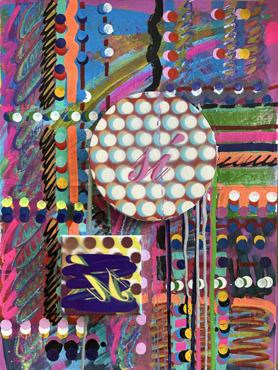 Medium: enamel & acrylic paints with acrylic ink & collage elements on canvas